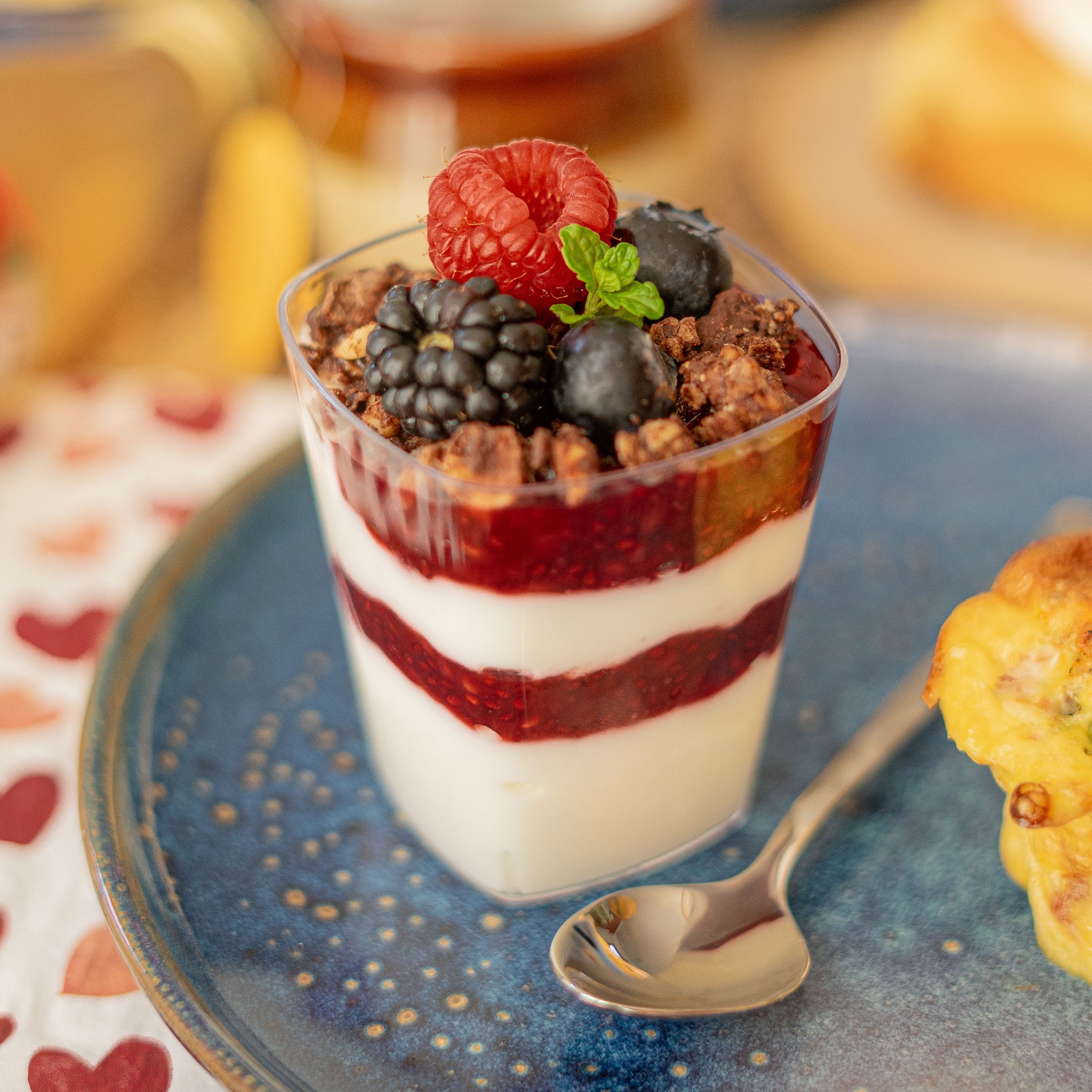 - yoghurt parfait met chocoladegranola, rode vruchten jam & vers rood fruit